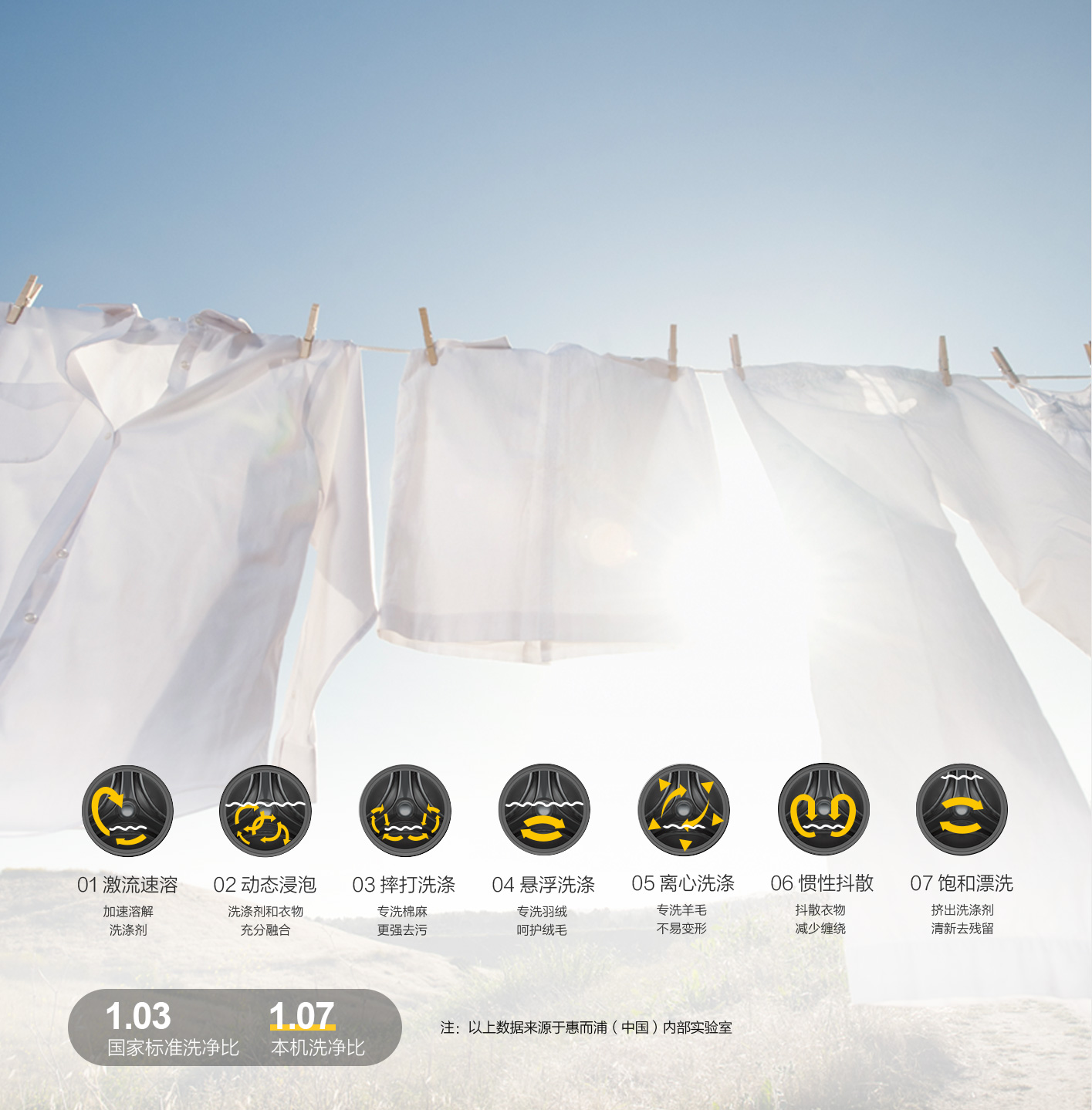 利用DD电机的准确控制能力,实现7种水流模式,净衣更护衣。