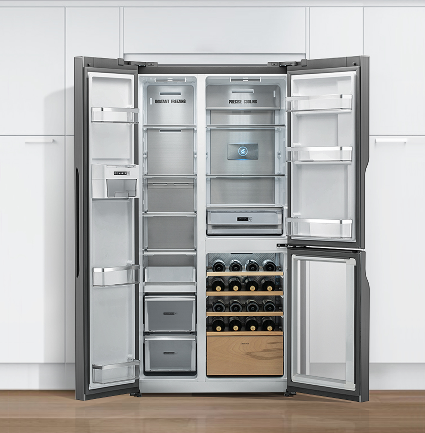 底部散热,无需预留散热空间; 90°开门,冰箱贴墙放也能轻松取物。