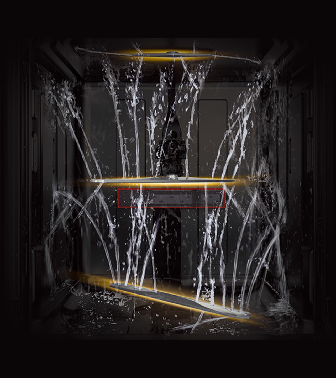 拥有34个多角度出水孔,每层喷淋臂都能上下双向出水,形成全方位喷淋覆盖,洁净每一件餐具。