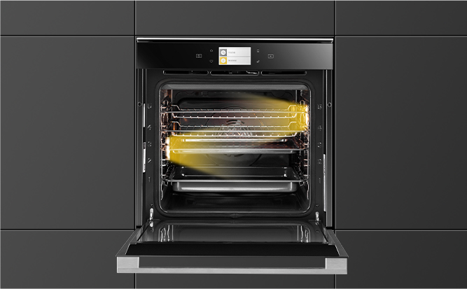 导轨可伸出腔体外支撑烤盘、烤架,易于取放和翻面, 即使承重时也能顺畅伸缩,让烹饪操作更顺手