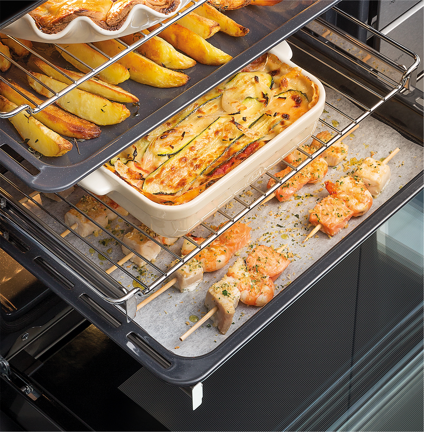 导轨可伸出腔体外支撑烤盘、烤架,易于取放和翻面, 即使承重时也能顺畅伸缩,让烹饪操作更顺手